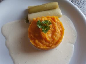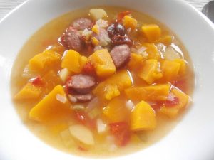 Du kannst sie aus Butternut- oder Hokkaidokürbis kochen, sie sollte aber nicht zu dick werden, sondern eine sanfte sahnige samtige Konsistenz haben. Du kannst die →Kürbiscremesuppe als Vorspeise mit ein paar tropfen Kürbiskernöl reichen, oder auch als Einlage ein kleines Stück gebratenen Steinbeißer oder kurz angebratene Garnelen dazugeben.