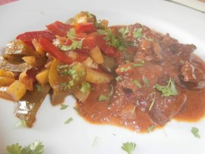 schmeckt jetzt im Winter besonders gut, ist aber nicht jahreszeitlich eingeschränkt. Herrlich zart, sanft geschmort passt es zu allen möglichen Gemüsen und Beilagen. Du kannst anstelle von Reh auch Wildschwein oder Hirsch nehmen. Und wenn du nicht unbedingt ein Freund von Wildfleisch bist: Für dieses Ragout eignet sich auf jeden Fall auch Rindfleisch. Dann fehlt vielleicht das feine Wildaroma, aber das ist ja wie so oft Geschmackssache. Ich habe zu dem →Rehragout ein Gemüse aus Paprika, Zucchini und Staudensellerie, mit Zwiebeln und Knoblauch in Olivenöl geschmort, serviert.