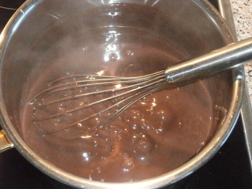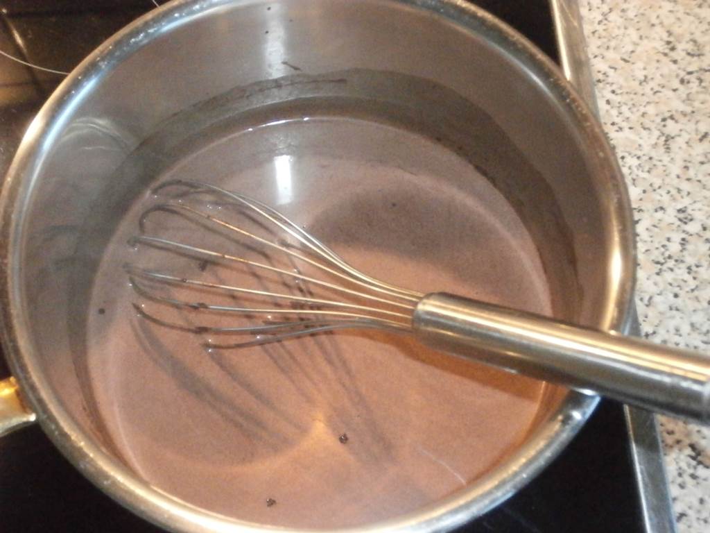 - 550 ml Milch mit dem Zucker, Vanillezucker und Kakao in einen Topf geben und unter ständigem Rühren zum Kochen bringen.