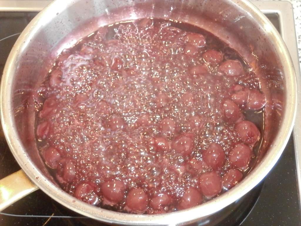 - Wenn die Flüssigkeit beginnt, leicht (!) zähflüssig zu werden, die abgetropften Kirschen hineingeben.