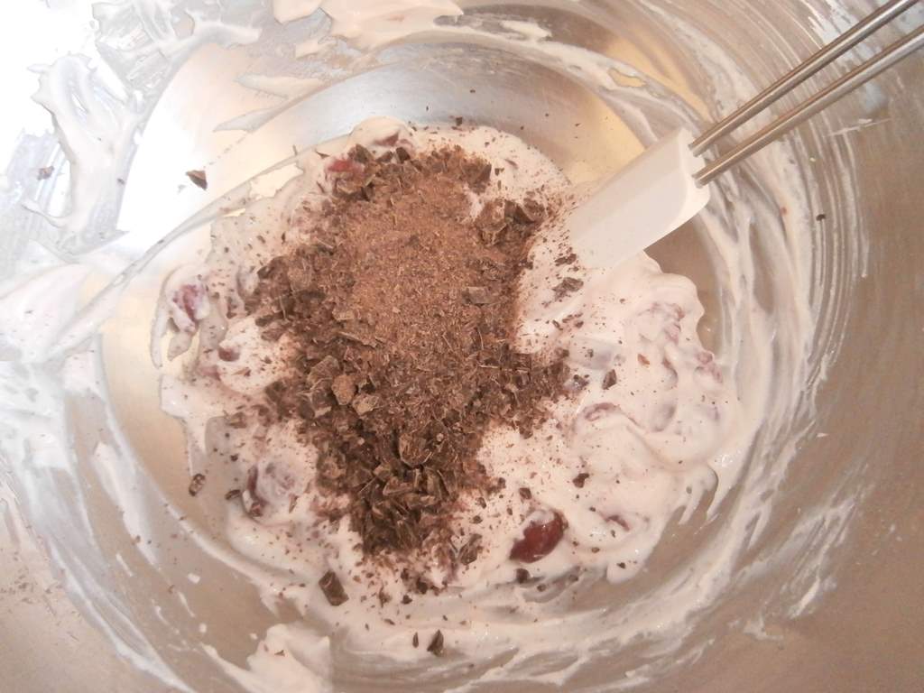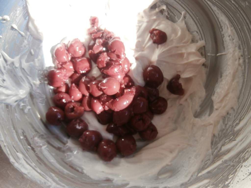 - Die abgetropften Kirschen und die Schokolade dazugeben und unterheben.