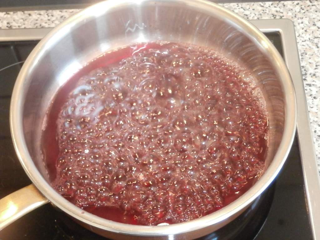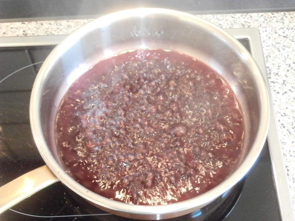 - Wenn nur noch die Hälfte übrig ist, das Brombeergelee einrühren und weiter reduzieren.