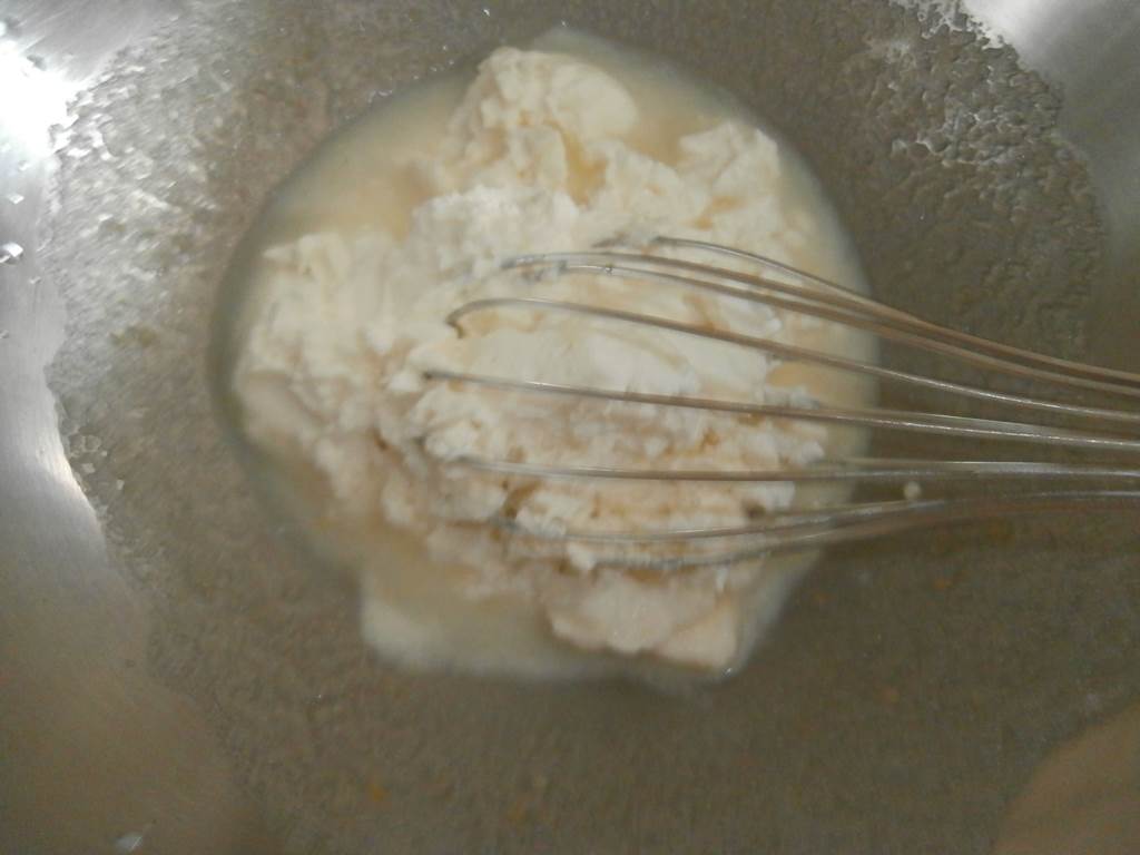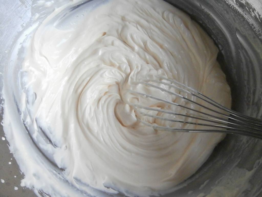 - Mit dem Schneebesen den Mascarpone esslöffelweise in die Creme einrühren. Darauf achten, dass keine Klümpchen bleiben.