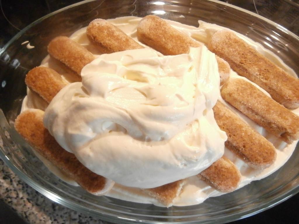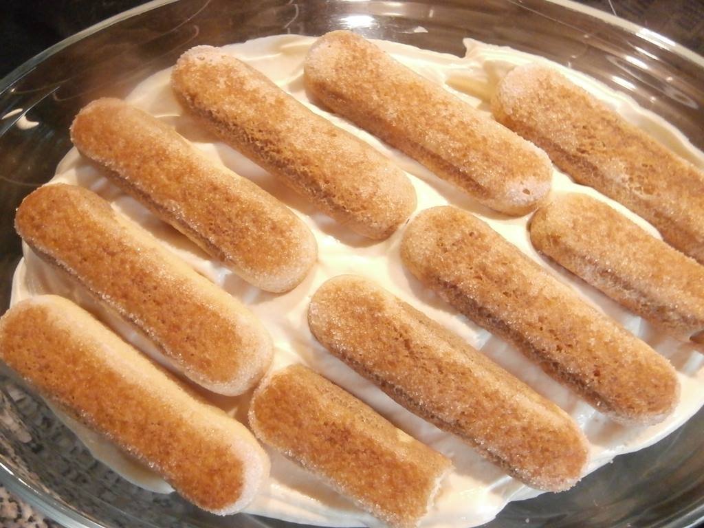 - Eine zweite Schicht mit der Kaffee-Amaretto-Mischung getränkte Biskuits auf die Creme in die Form legen.