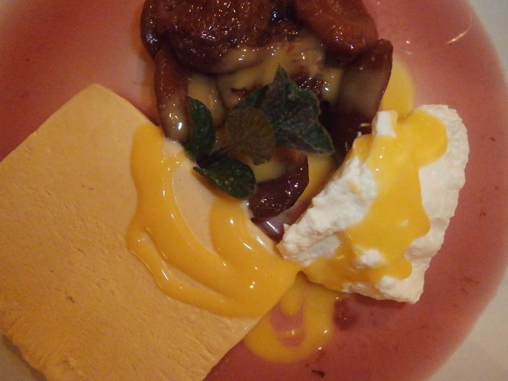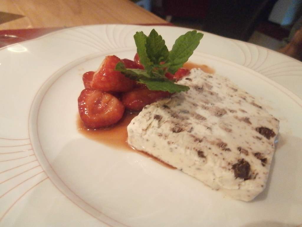 Du gibst einen Löffel Zwetschgen auf einen Teller und legst eine Scheibe Sanddornparfait daneben. Dazu ein wenig von dem Zwetschgensaft, ein Klecks Schlagsahne und ein Schuss Eierlikör – ein nicht alltägliches Dessert.
