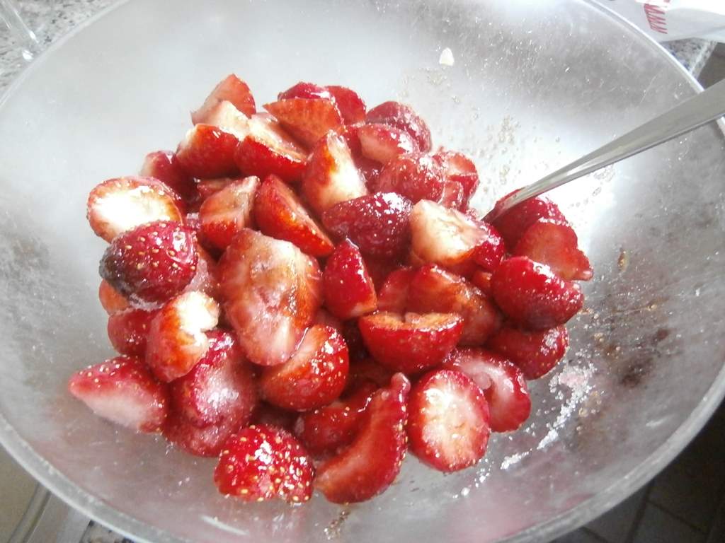 - 500 g kleine Erdbeeren kurz kalt abbrausen, putzen, die größeren halbieren und in eine Schüssel geben.
