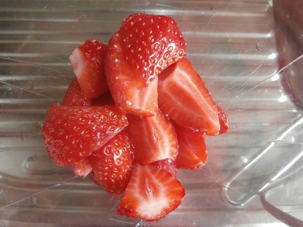 - Die Erdbeeren kalt abbrausen, putzen und halbieren/vierteln.