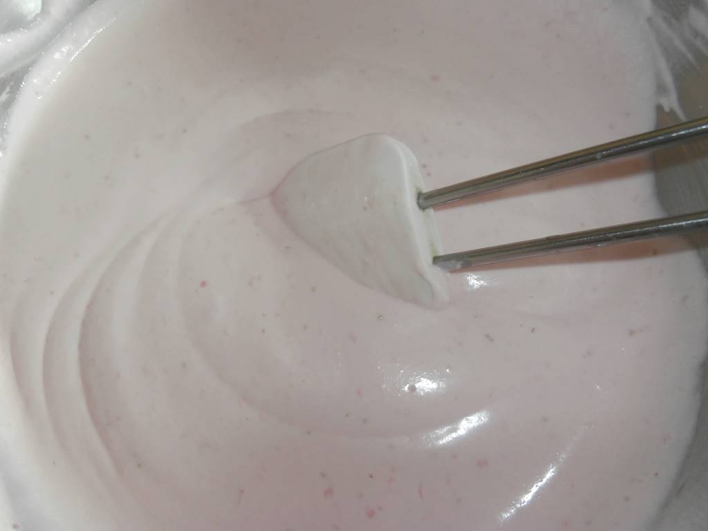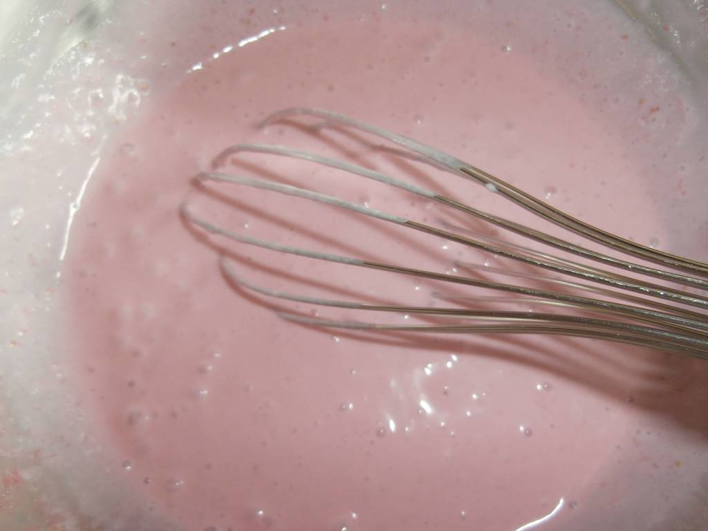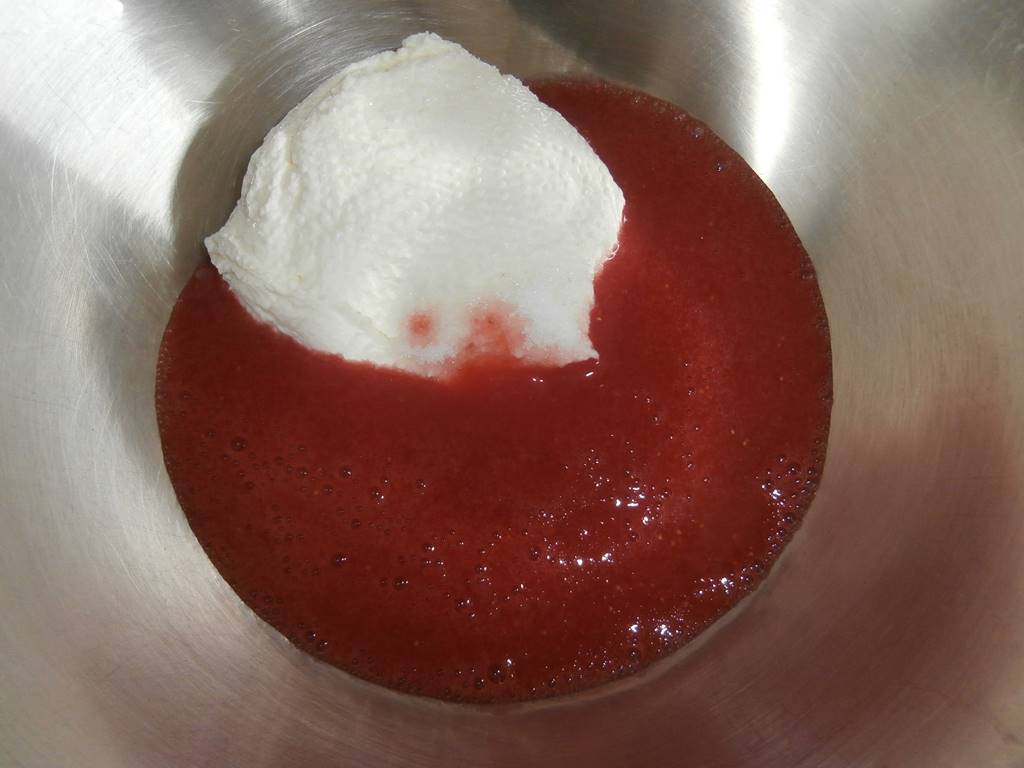 - Die pürierten Erdbeeren dazu und mit einem Schneebesen alles schön glatt verrühren.