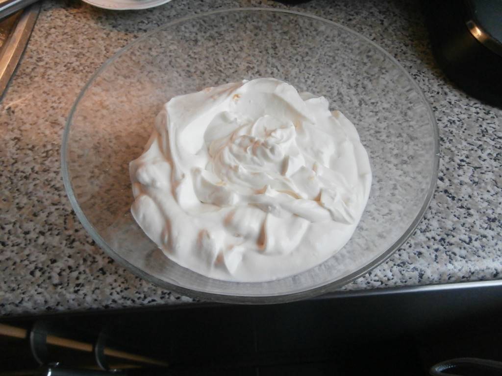 - Dann die geschlagene Sahne mit einem Teigschaber unterziehen. In eine Schüssel füllen und kalt stellen.