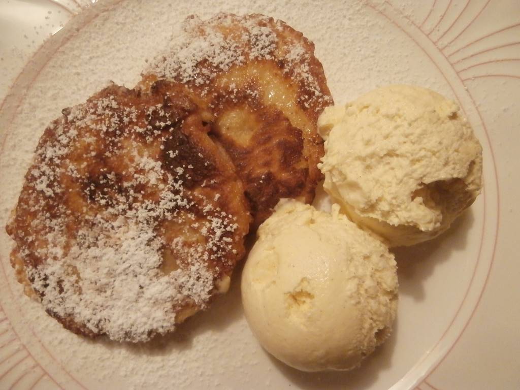 Eine Abwandlung von Apfelpfannkuchen sind diese gebackenen Apfelringe. Heiß und kalt mit Vanilleeis kombiniert mal eine andere Art von Dessert. Wichtig ist aber auf jeden Fall ein frischer aromatischer Apfel.