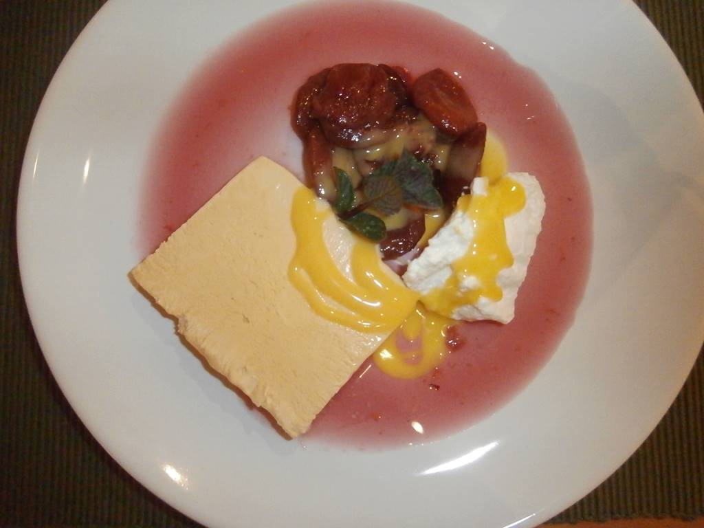 Du gibst einen Löffel Zwetschgen auf einen Teller und legst eine Scheibe Sanddornparfait daneben. Dazu ein wenig von dem Zwetschgensaft, ein Klecks Schlagsahne und ein Schuss Eierlikör – ein nicht alltägliches Dessert.