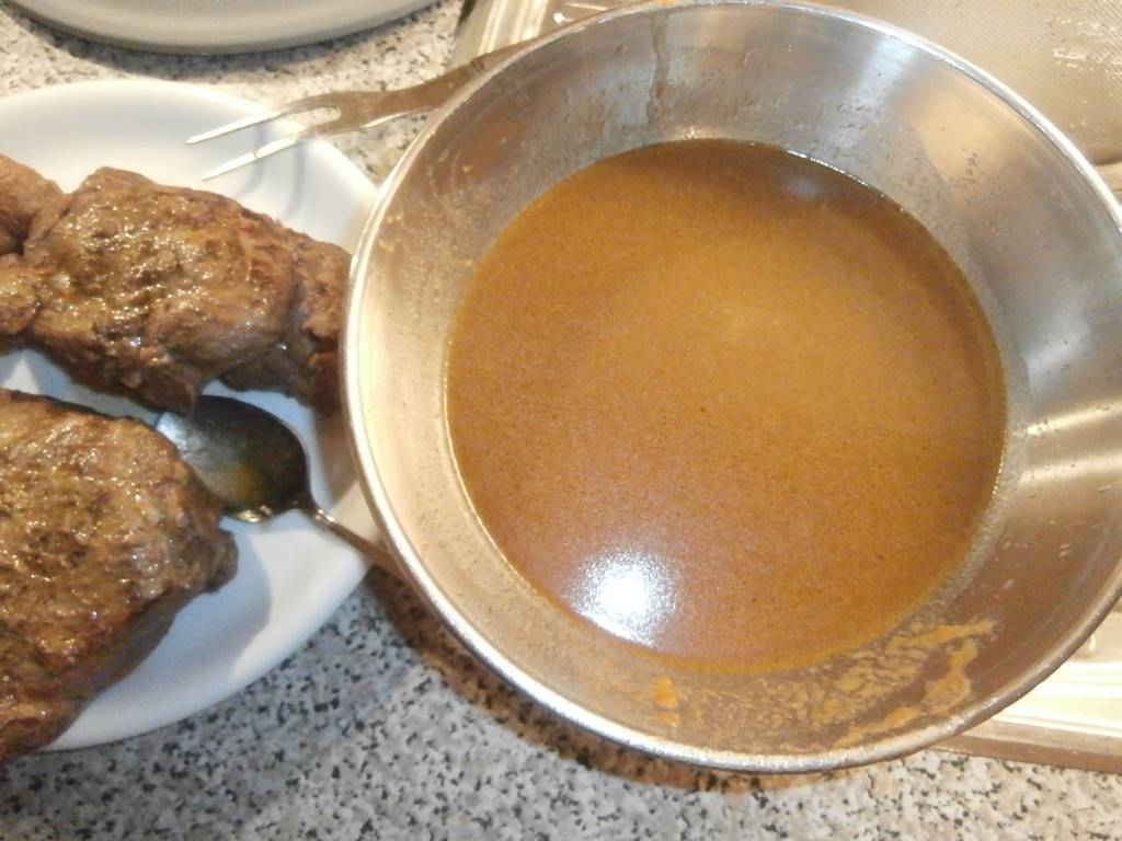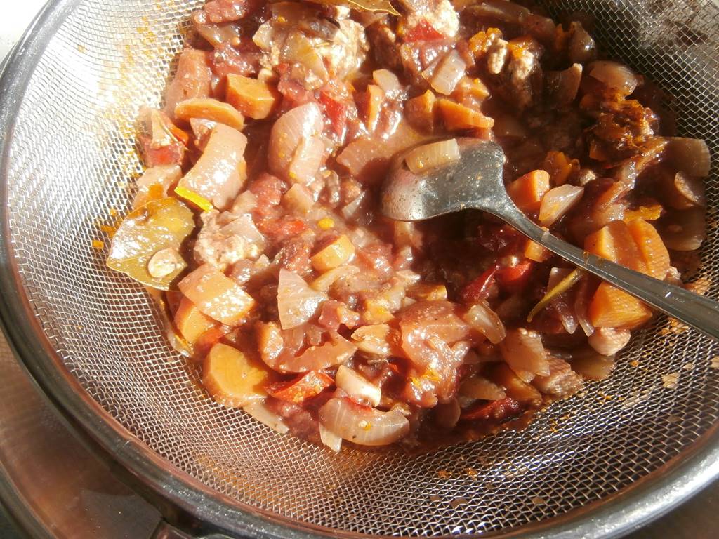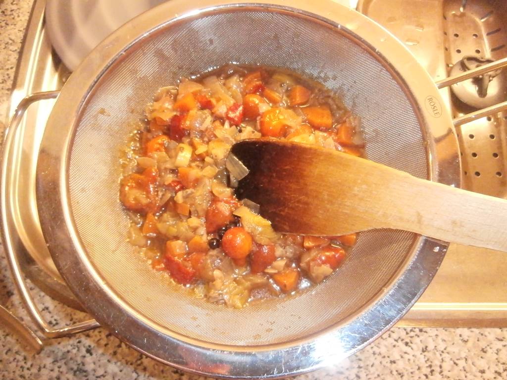 • Den Inhalt des Schmortopfes durch ein feines Sieb passieren. Du hast jetzt so etwas wie eine Saucenbasis. Den Topf auswischen, Sauce hinein, Siebinhalt wegwerfen.