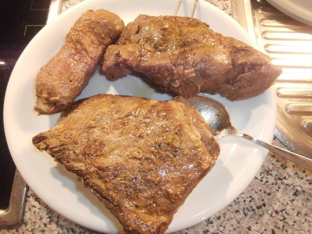 • Fleisch aus der Pfanne nehmen und auf einen Teller legen, Kräuter darüber legen, Bratfett darüber gießen. Die Pfanne brauchst du danach für die Sauce.