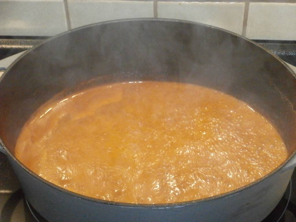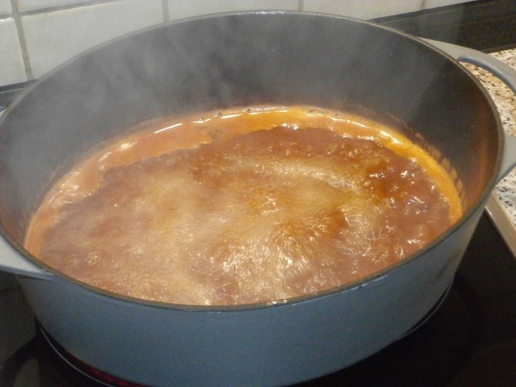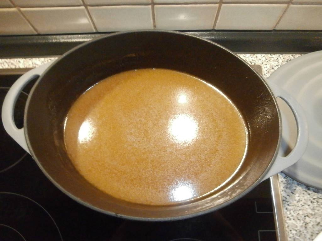 • Die Sauce auf starker Hitze reduzieren, mit einem Löffel enstehenden Schaum und Verunreinigungen immer wieder abschöpfen.