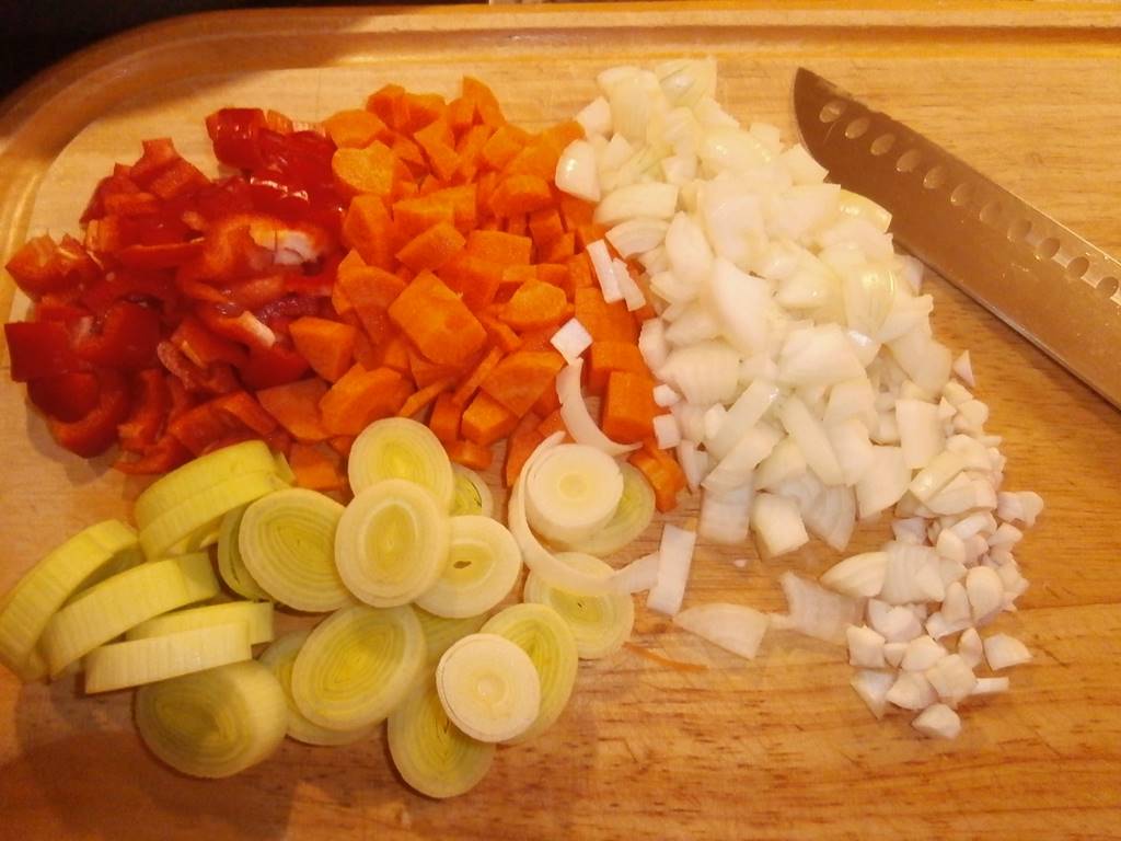 • Möhren putzen, schälen und in kleine Stücke schneiden.