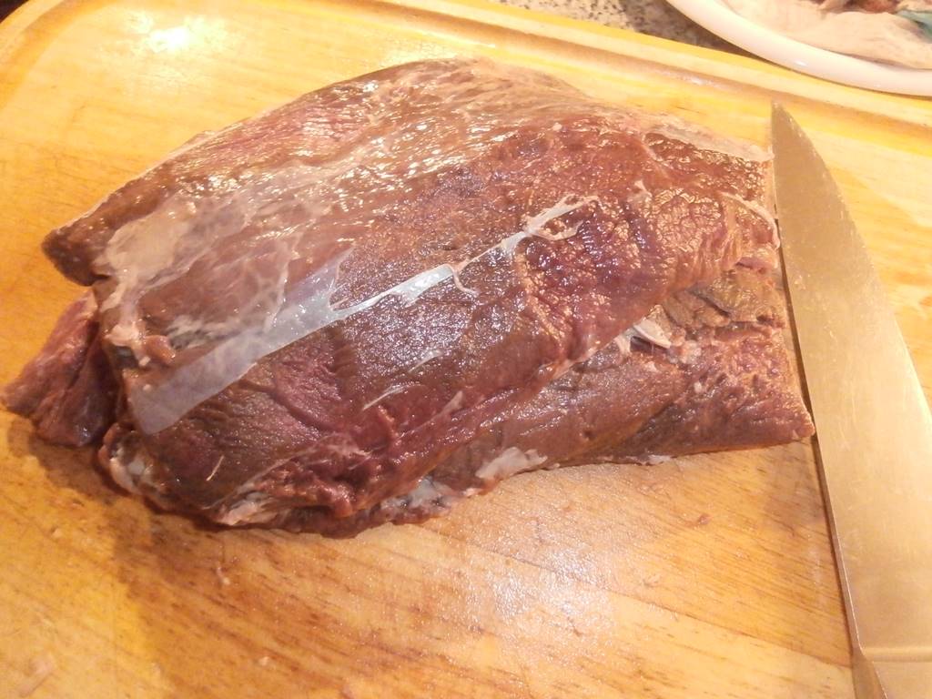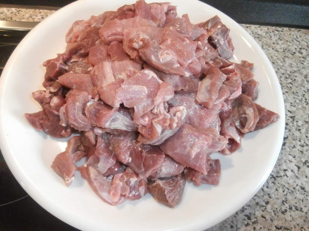 • Das Fleisch von Fett, Sehnen und Häuten befreien und in 3 ungefähr gleich große Stücke zerteilen.