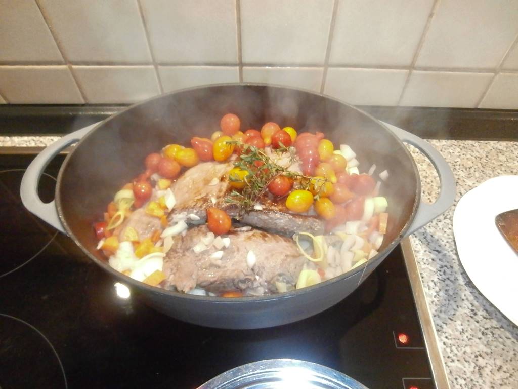 • Deckel auflegen und den Bräter in den auf 120° vorgeheizten Backofen schieben (Der Bräter soll im Backofen mittig platziert sein).