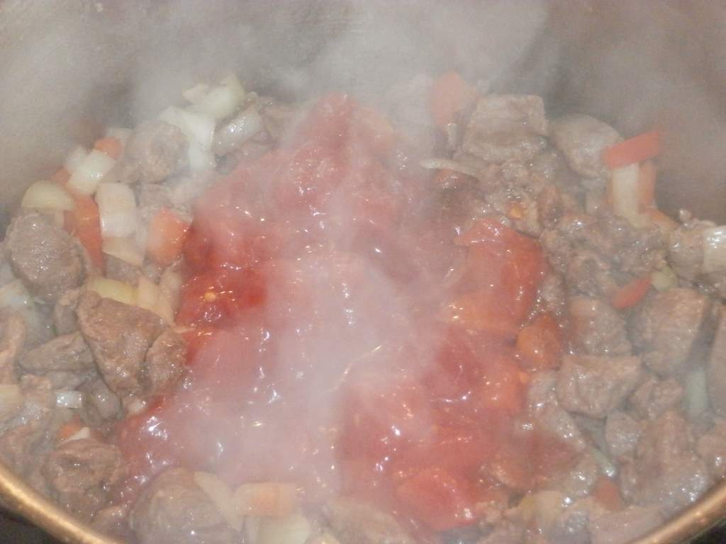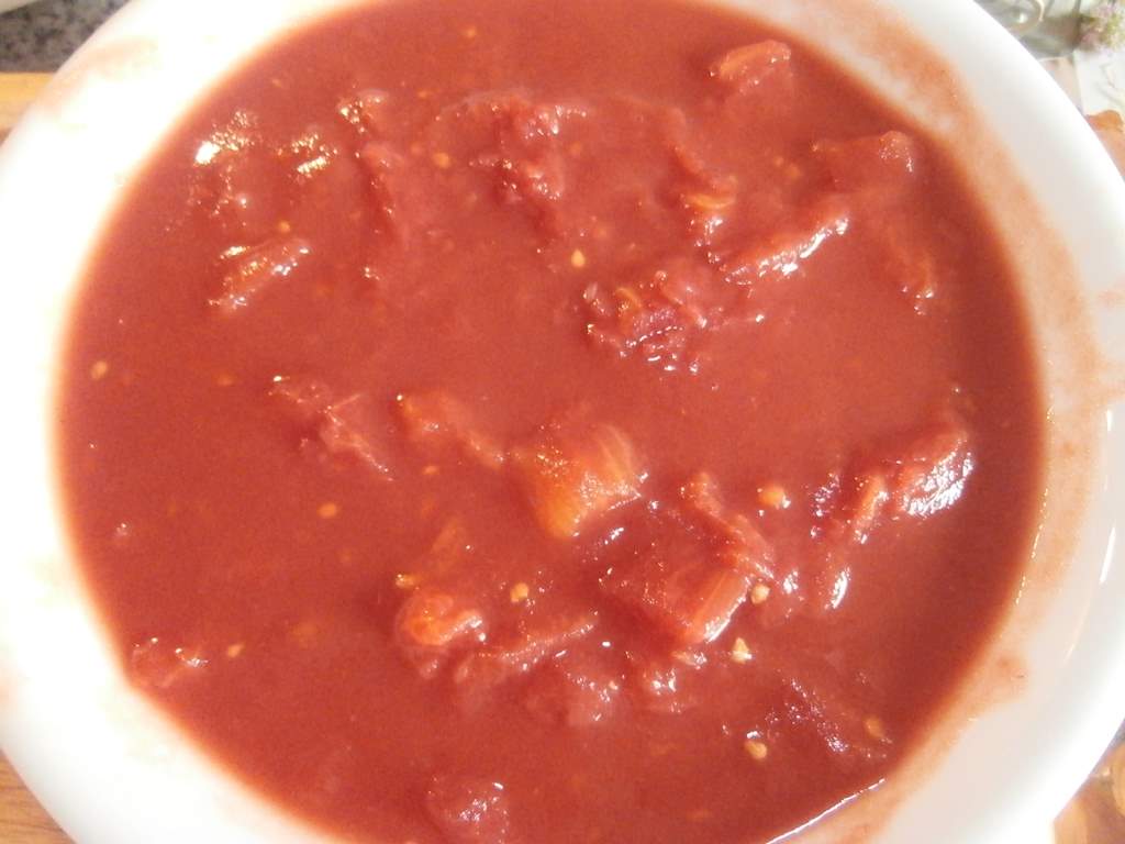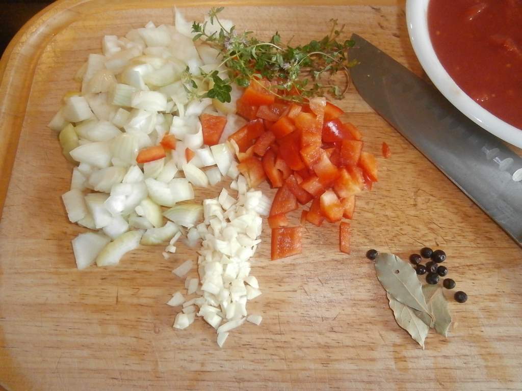 • Die Dosentomaten grob zerkleinern, dabei Stielansätze und evtl. Schalenreste entfernen.