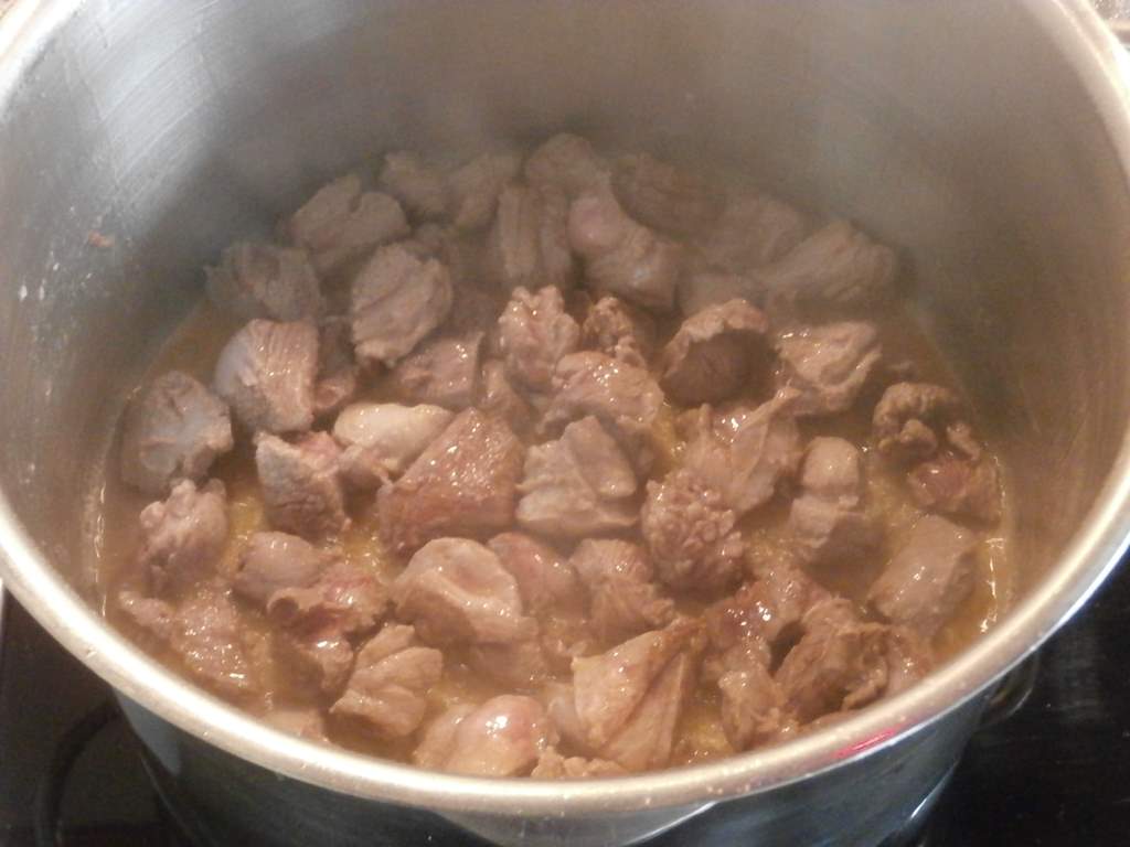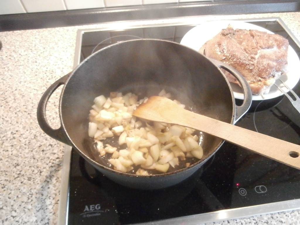 • Das Fleisch rundherum kräftig anbraten. Das geht wahrscheinlich nicht auf einmal, weil die Fleischstücke auf dem Topfboden nebeneinander Platz haben sollten. Also am besten in zwei oder drei Portionen anbraten.