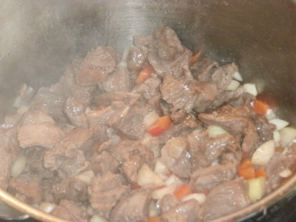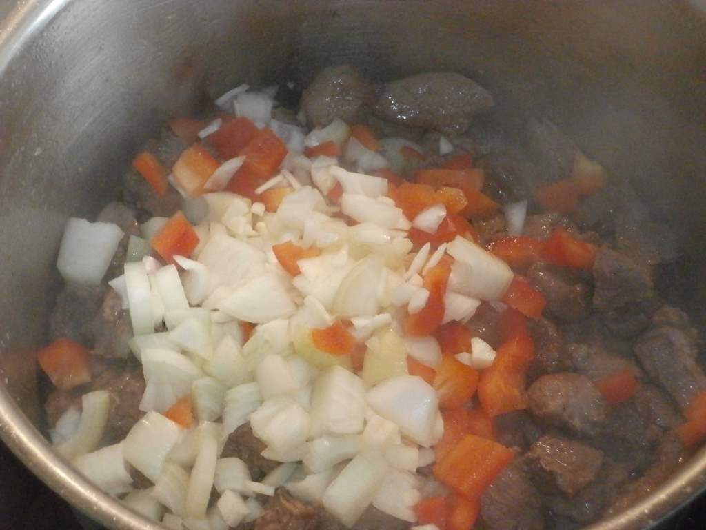 • Zwiebeln, Knoblauch und Paprika zum Fleisch geben und kurz mitbraten.