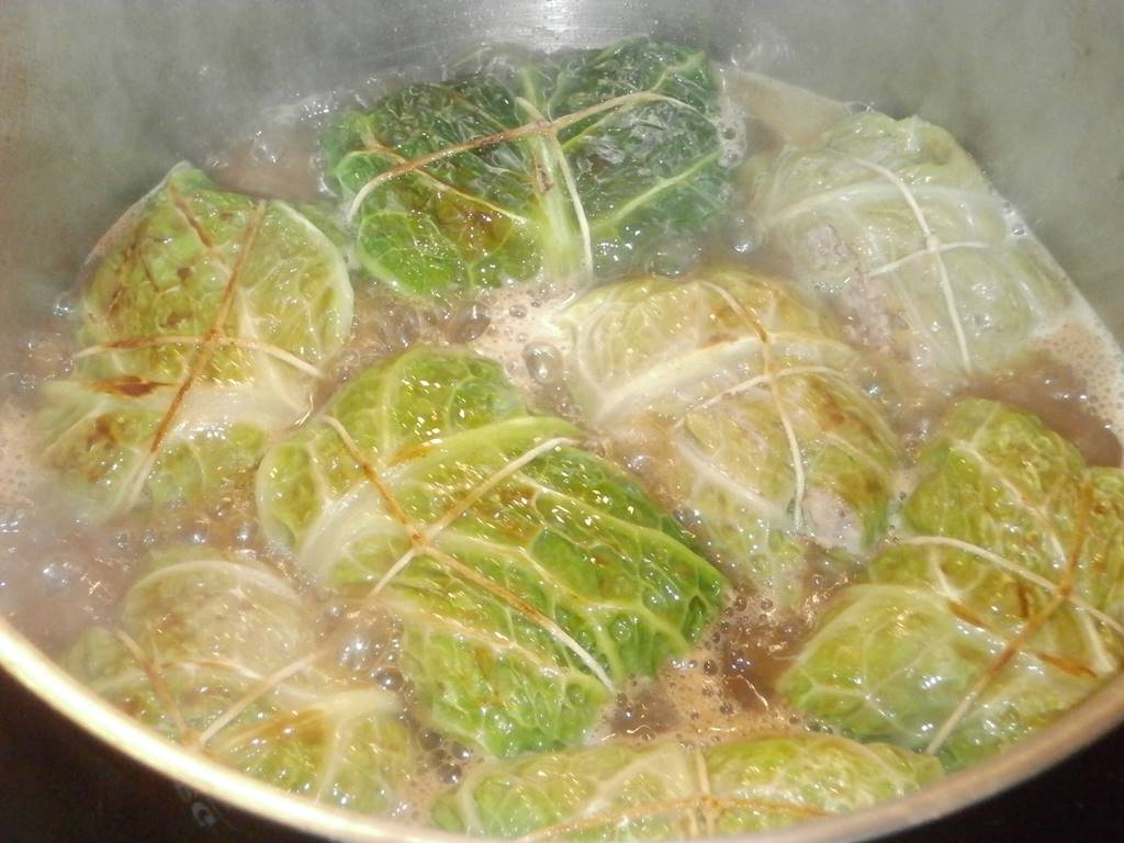 • Auf jedes Wirsingblatt eine Portion Teig geben und zusammenrollen.