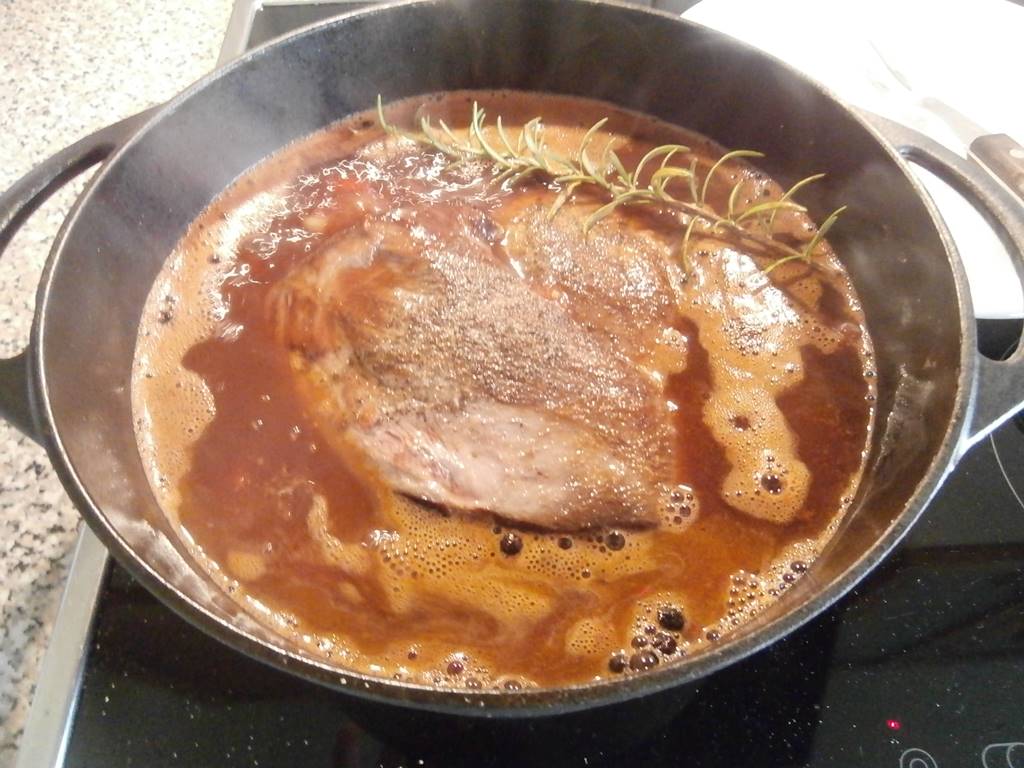 • Lorbeerblätter, Wachholderbeeren, Senf und Johannisbeergelee dazugeben, Rosmarinzweig obendrauf legen, Deckel schließen und den Topf mittig in den auf 110° Umluft vorgeheizten Backofen stellen und 4 Stunden schmoren lassen.