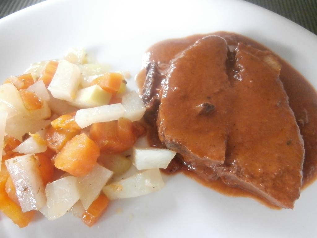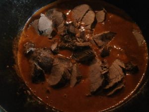 • Das Fleisch in Scheiben schneiden (vorsichtig, es könnte zerfallen) und in der Sauce ohne Kochen aufwärmen.