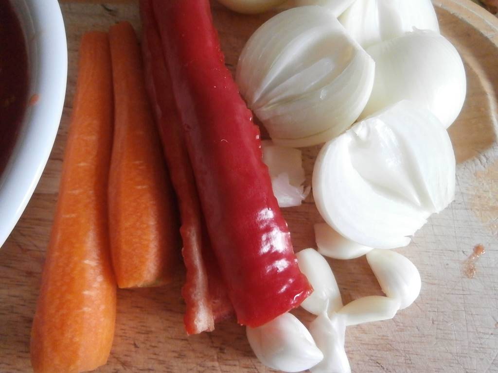 • Dann Möhren und Paprika dazugeben und Farbe nehmen lassen.