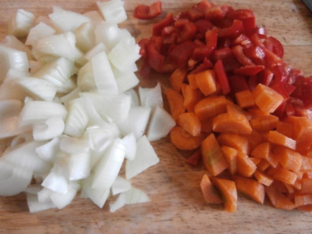 • Paprika abwaschen, Kerne entfernen und in kleine Stücke zerteilen