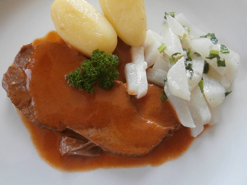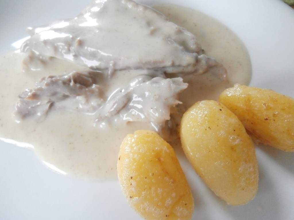 • Das Fleisch in Scheiben schneiden (vorsichtig, es könnte zerfallen) und in der Sauce ohne Kochen aufwärmen.
