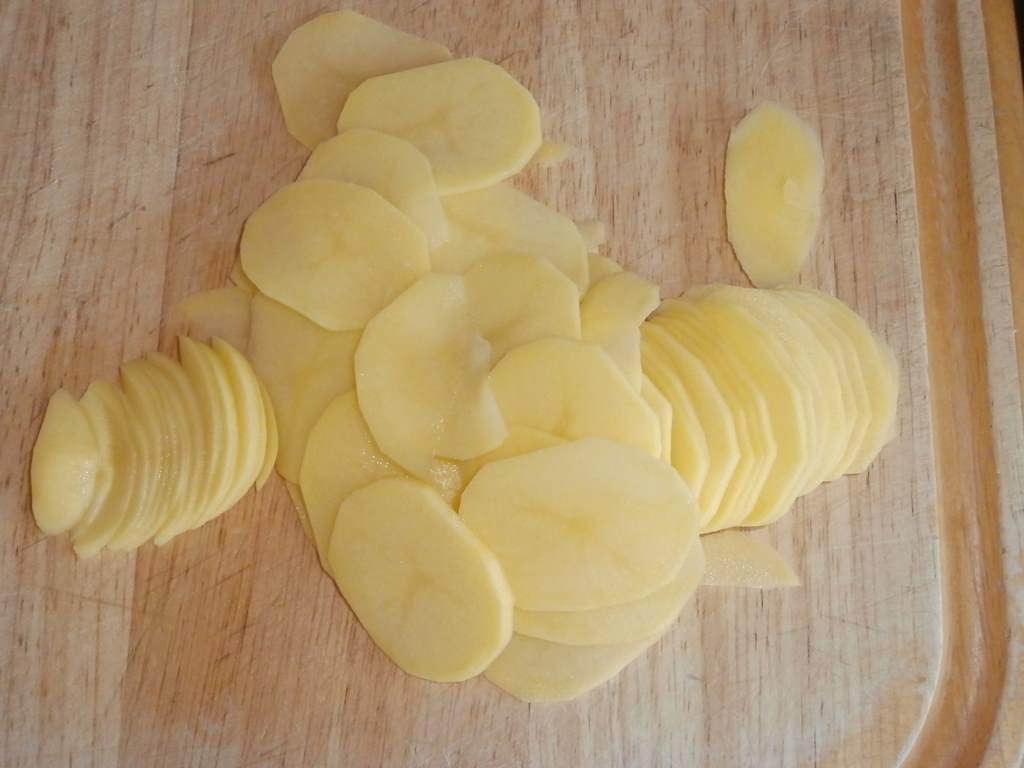 - Kartoffeln schälen, waschen und in millimeterdünne Scheiben schneiden.