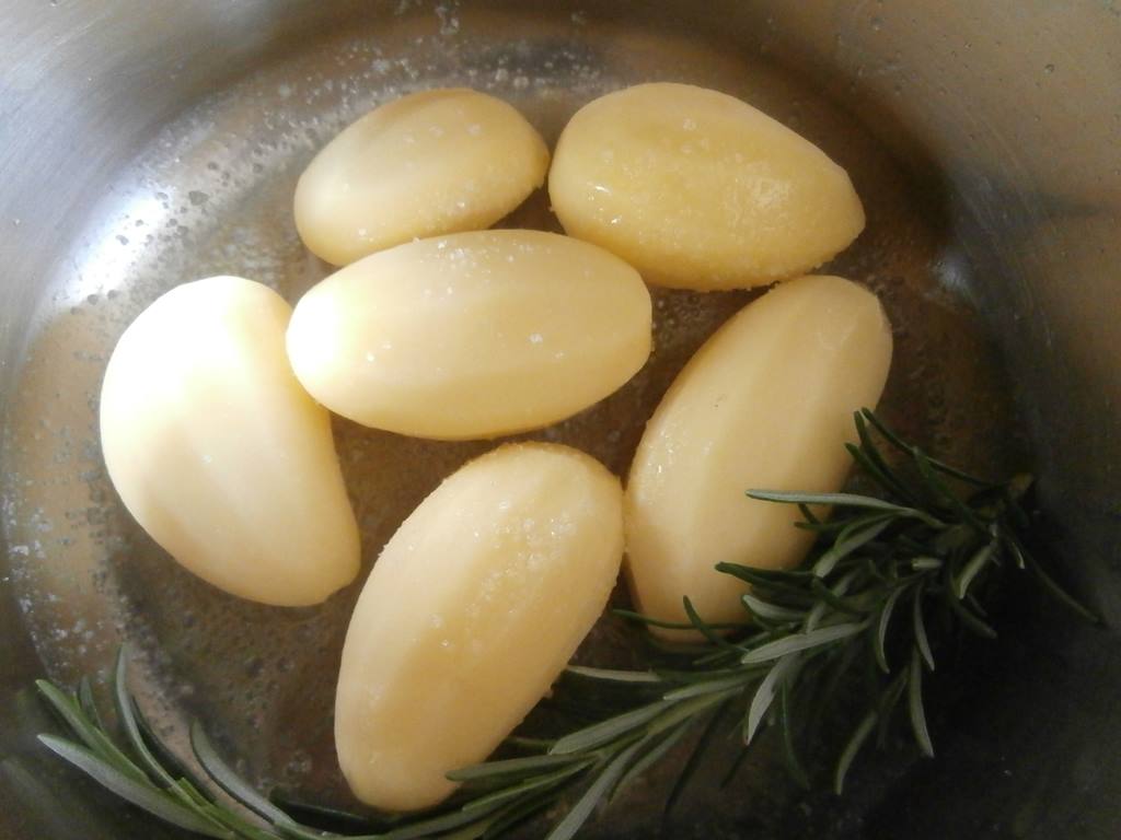 - Die ganzen Kartoffeln dazugeben, ebenso die Kräuter, salzen.