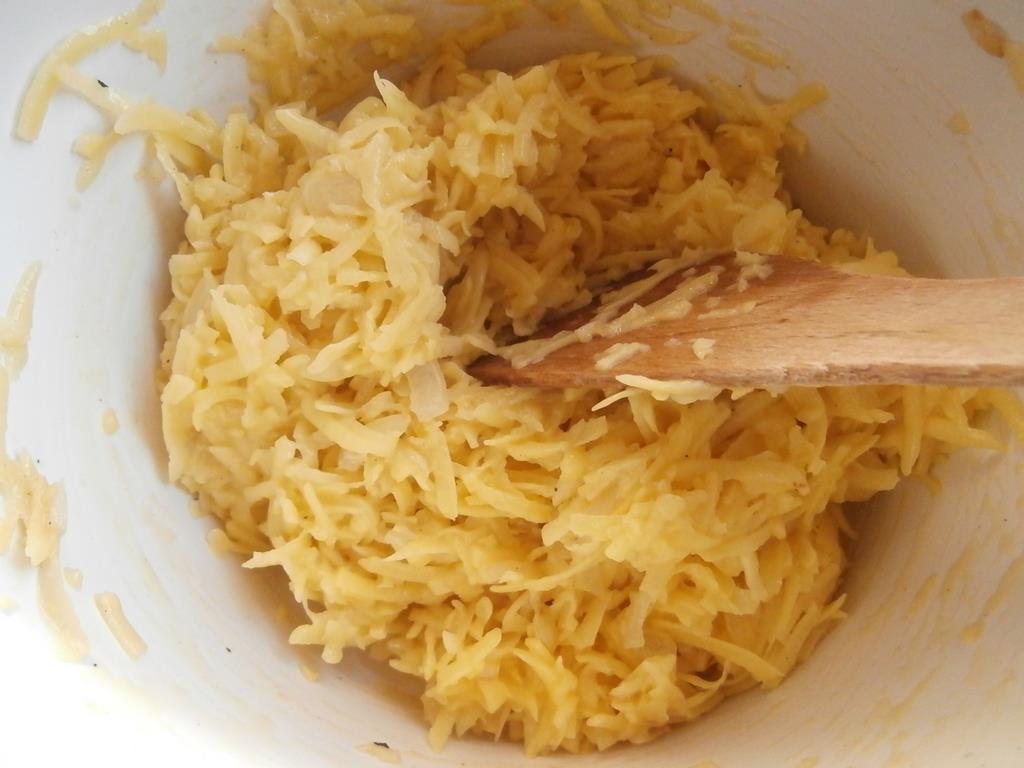 - Die Kartoffeln in grobe Stücke schneiden und zusammen mit den Zwiebelhälften in die Schüssel hinein reiben (z.B. mit dem Reibeaufsatz des Handmixers).