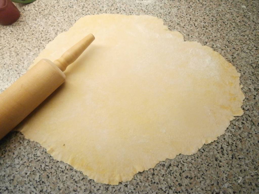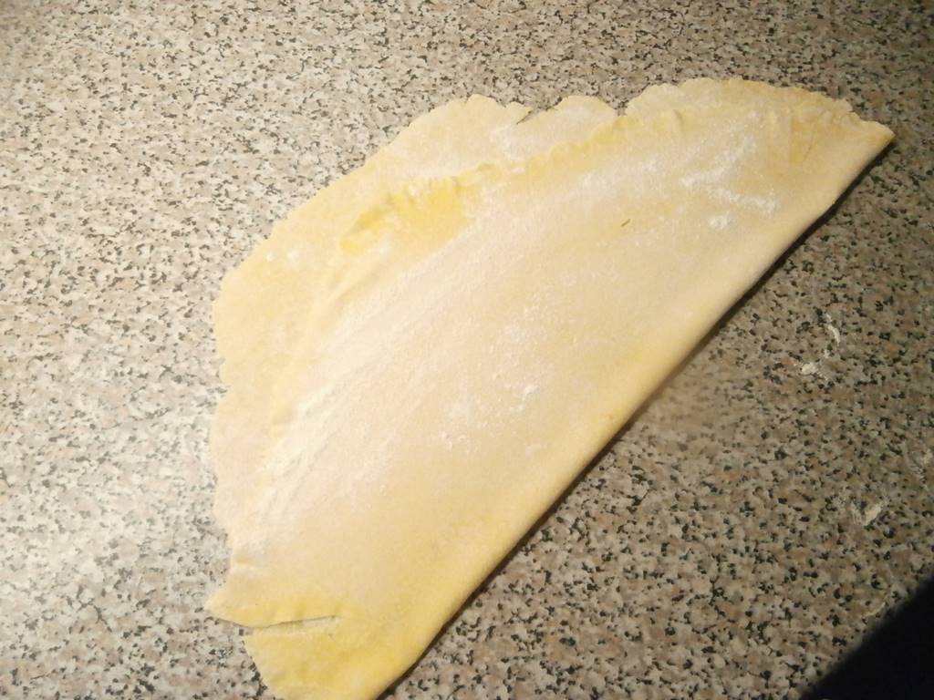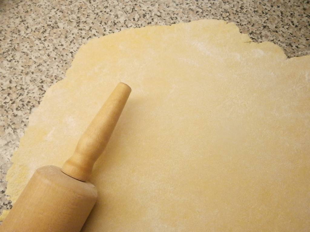 - Mehl auf die Arbeitsfläche geben und den Teig sorgfältig sehr dünn ausrollen. Dabei die Teigplatte immer wieder wenden und mit Mehl bestreuen.