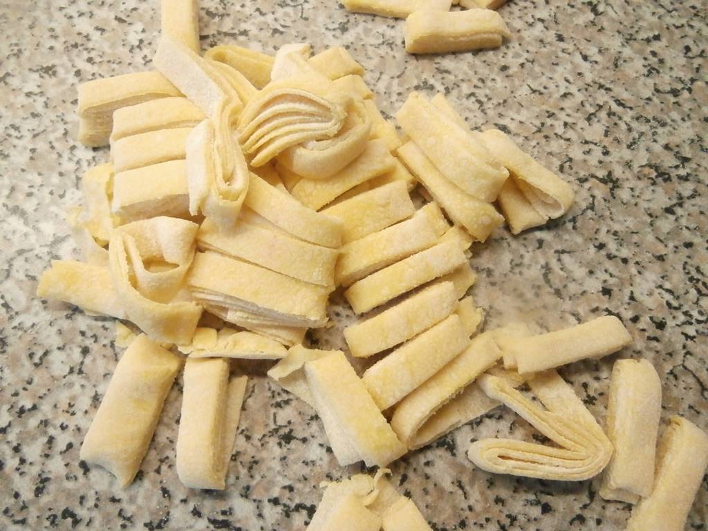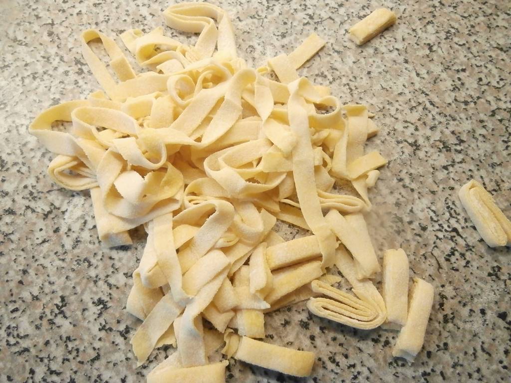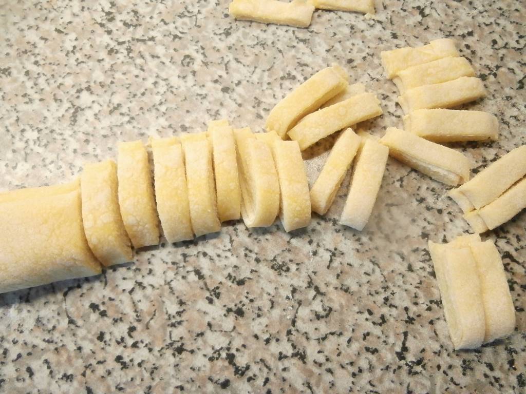 - Die millimeterdünne Teigplatte mehrfach zusammenklappen und mit einem scharfen Messer in ca. 1 cm breite Stücke schneiden. Die Stücke sofort mit den Händen auflockern, damit nichts zusammenklebt.