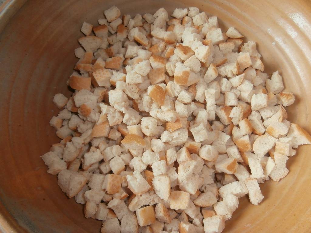 - Das Brot in kleine Stücke brechen und in eine Schüssel geben.