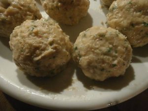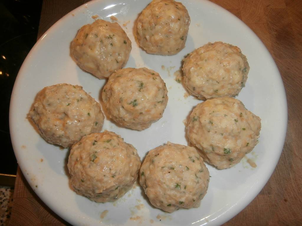 - Mit feuchten Händen Knödel formen (du bekommst 6 – 8 Stück aus dem Teig).