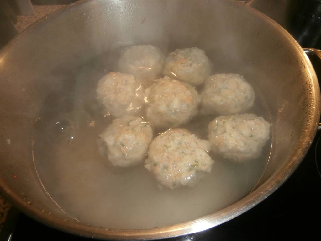 - Vorsichtig in leicht kochendes Salzwasser legen (die Knödel steigen nach kurzer Zeit nach oben) und ca. 15 MInuten gar ziehen lassen (nicht kochen).