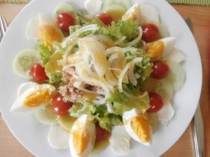 Zum Beispiel Lollo bionda mit Gurkenscheiben, Kirschtomaten, Mozarella und hartgekochtem Ei. Obendrauf Thunfisch und Zwiebeln oder Schalotten, dazu eine Honig-Feigensenf-Vinaigrette – total lecker.
