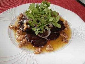Rote Bete Salat mit karamellisierten Walnüssen und Wildkräutern