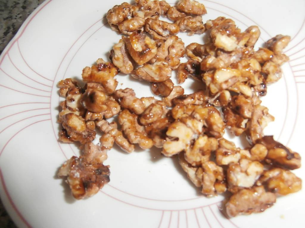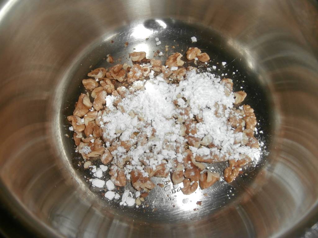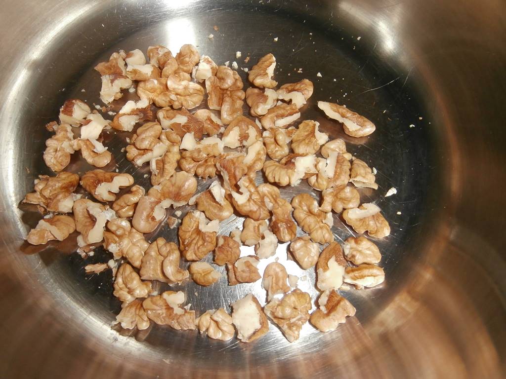 - Die Walnusskerne grob zerkleinern und in einem Topf ohne Fett anrösten.