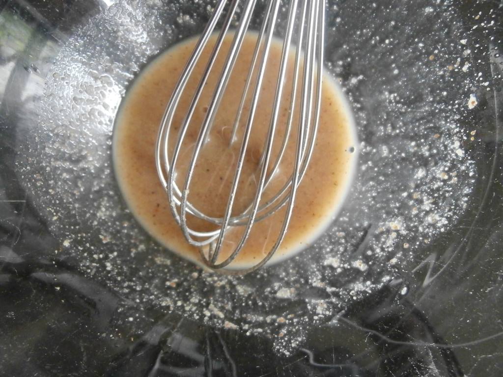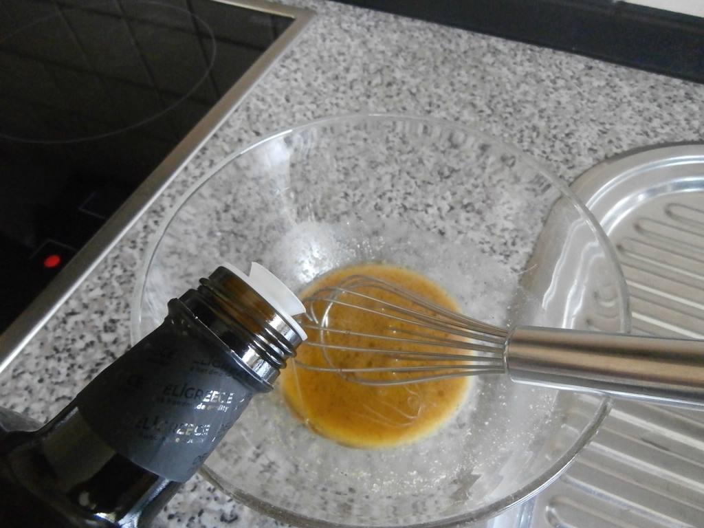 • Das Olivenöl langsam unter ständigem Rühren mit dem Schneebesen einlaufen lassen.