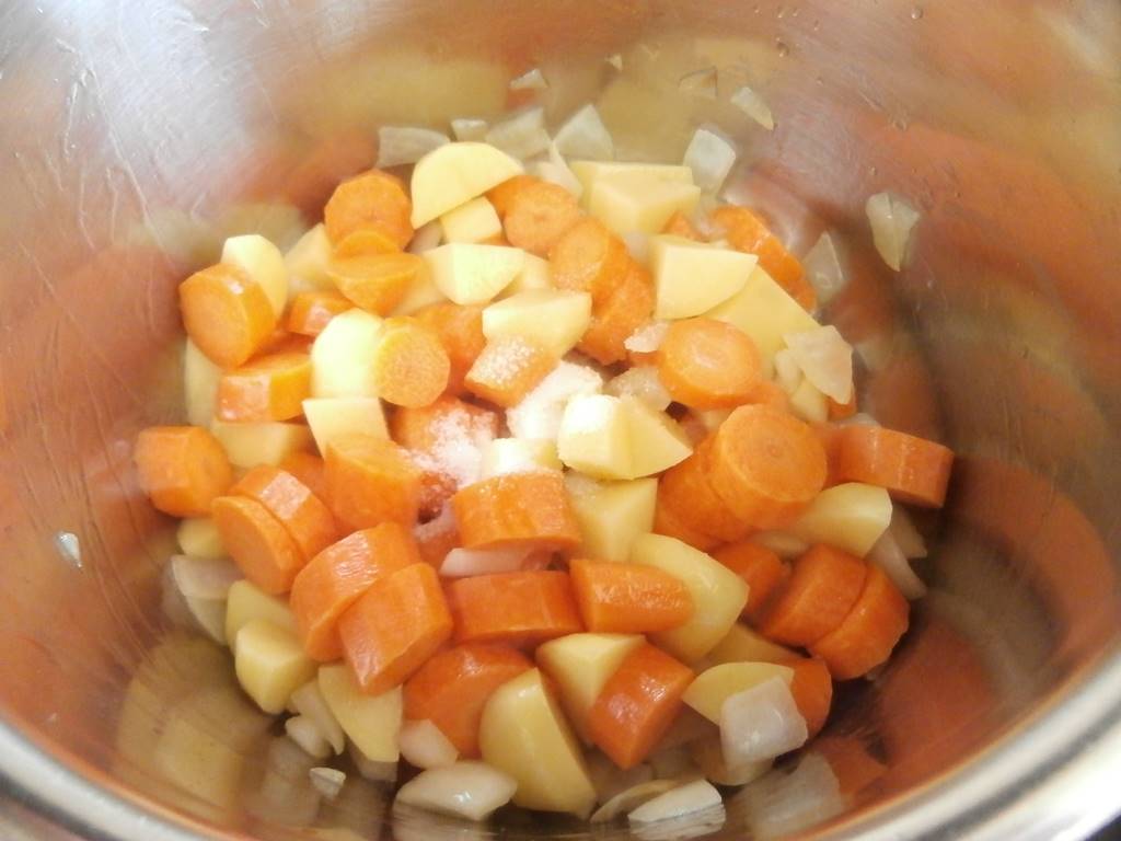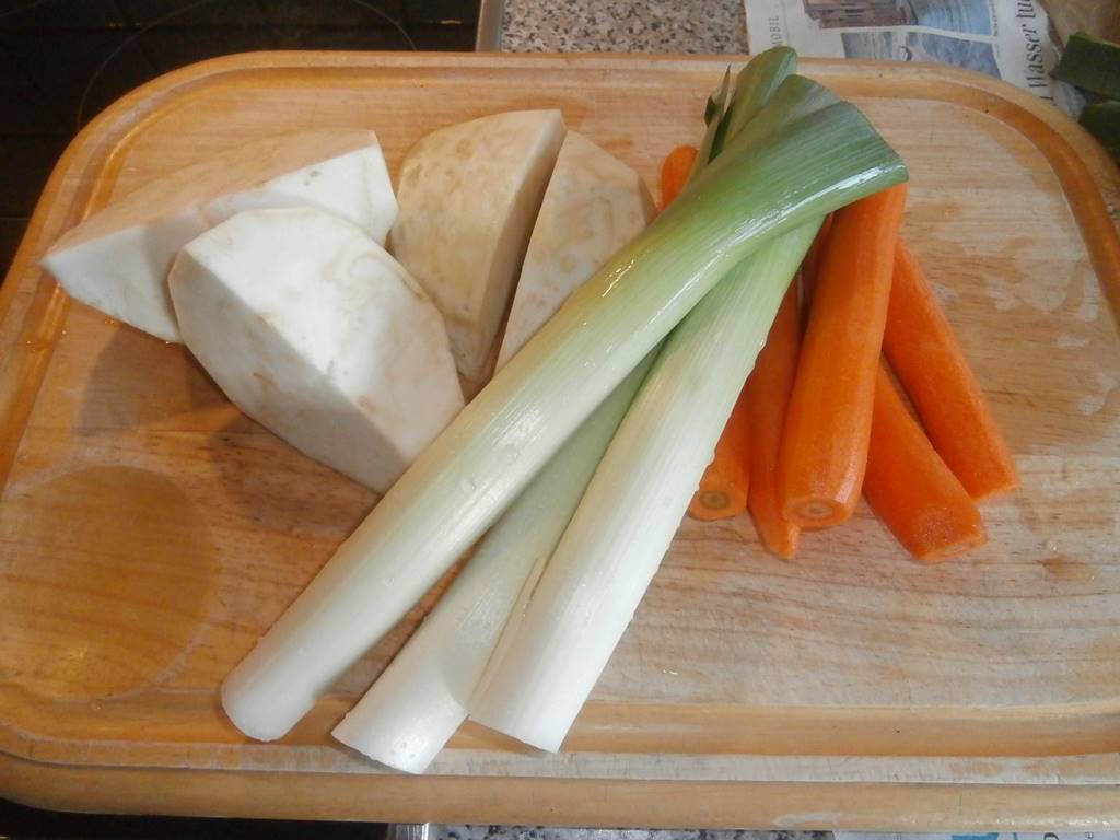 - Dann Salz, Suppengemüse und Pfefferkörner hineingeben.