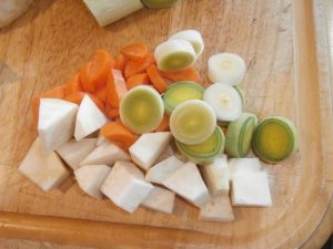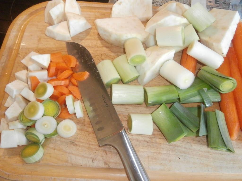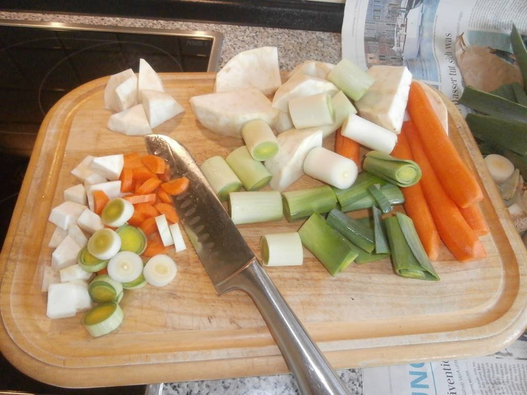 Mein Suppengemüse besteht aus einem Stück Sellerie, einer Möhre und einem Stück Lauchstange. Es lässt sich sehr gut in größeren Mengen herstellen und portionsweise einfrieren. Die hier abgebildete Menge (1 Sellerieknolle, 3 dicke Stangen Lauch, 5 große Möhren) ergibt 8 bis 10 Portionen.