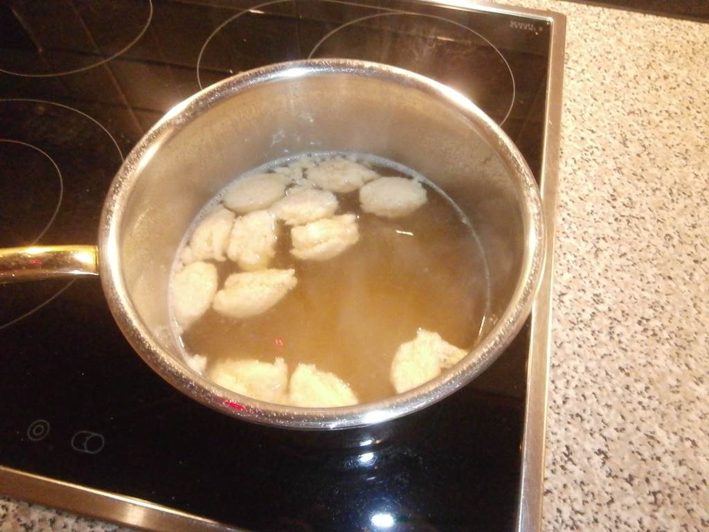 - Die Klößchen in die fast kochende Brühe geben und in 5 bis 8 Minuten gar ziehen lassen.
