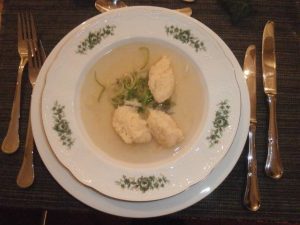 In jeden Teller einen Esslöffel von den Lauchringen legen, darauf jeweils drei Klößchen und dann mit einer Portion Brühe übergießen. Wegschlürfen und glücklich sein.