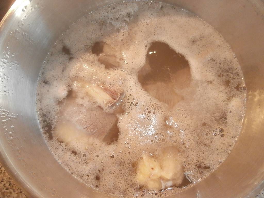 - Zum Kochen bringen. Den während des Kochens aufsteigenden Schaum, der viele Trübstoffe enthält und ein bisschen grau und wenig appetitlich aussieht, mit einem Löffel sorgfältig abschöpfen.