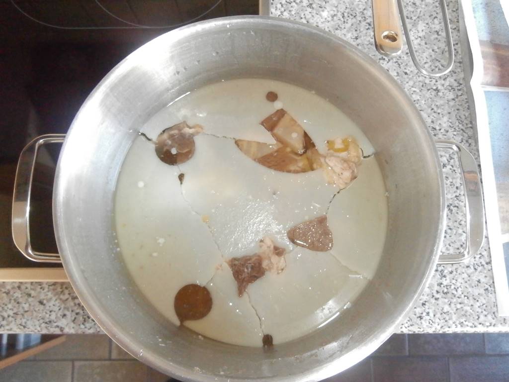 - Den Topf vom Herd nehmen und am besten über Nacht kalt stellen. Dabei wird das oben schwimmende Fett fest.
