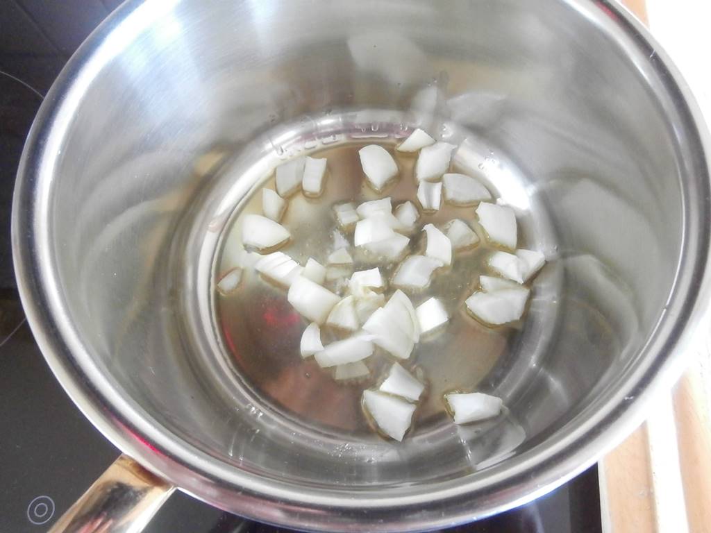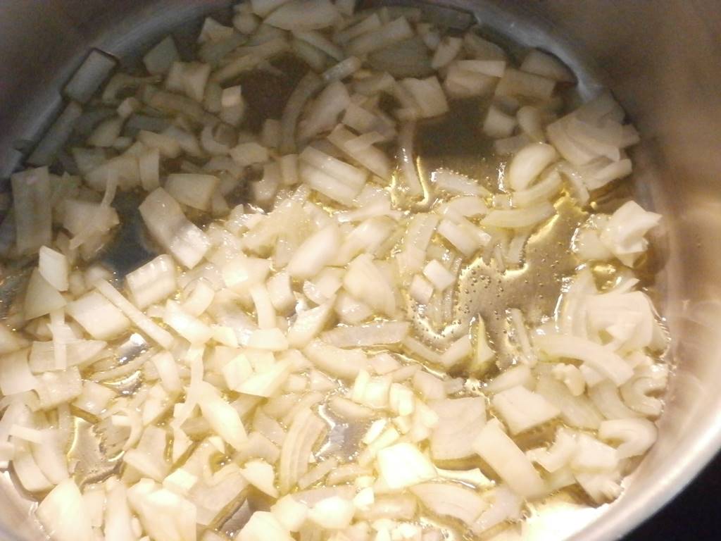 - Olivenöl in einem großen Topf erhitzen, Zwiebel dazugeben und glasig dünsten.