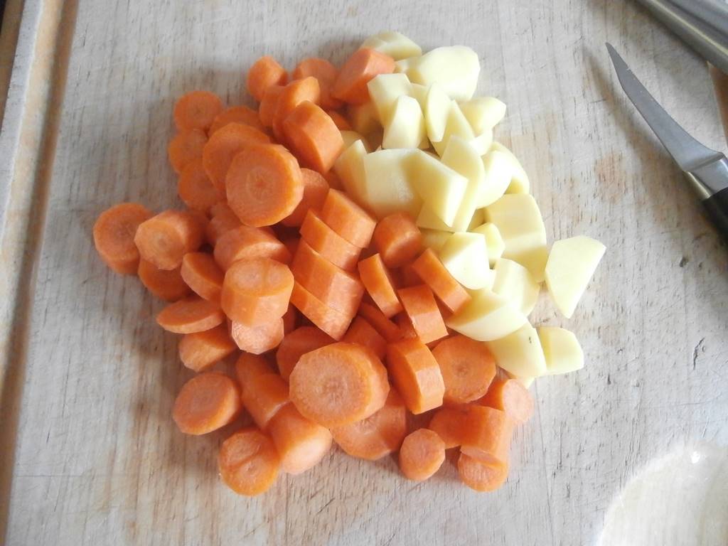 - Kartoffeln schälen und in kleine Würfel schneiden.